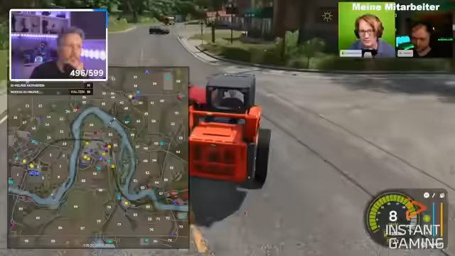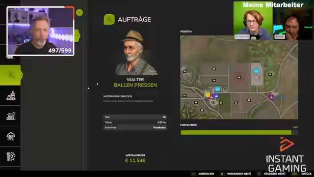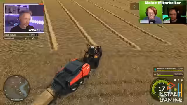 00:56:58Es wird das Spielkapital von 750.000 Euro erwähnt und dass die Wirtschaft auf "easy" gestellt ist. Es werden die Aufträge im Spiel besprochen, die über ein Menü zugänglich sind. Ein humorvoller Kommentar über einen möglichen Zeitungsartikel, in dem ein Zuschauer nach dem Nachahmen einer Aktion im Spiel stirbt, wird gemacht. Die Notwendigkeit, Maschinen für Aufträge zu mieten, wird hervorgehoben. Der Verkauf der produzierten Güter erfolgt über den Händler, zu dem man mit dem Ladewagen fährt. Es wird die Möglichkeit erwähnt, später im Spiel Bäckereien, Maschinen oder Fabriken zu kaufen. Das automatische Abladen mit dem Ladewagen wird als "High-Advanced-Shit" bezeichnet, lohnt sich aber aktuell nicht wegen der geringen Menge. Die Map, Job-Erstellung und die Möglichkeit, Aufgaben zu delegieren, werden kurz angesprochen. Die Frage, ob Stroh liegen gelassen oder für Tierfutter verwendet werden soll, wird aufgeworfen. Der Kauf einer Ballenmaschine wird diskutiert, wobei der Chat auf die spätere Verwendung von Stroh für Tierfutter hinweist. Es wird überlegt, ob die Ballenpresse des Mitspielers mitbenutzt werden kann. Das Mieten von Sachen wird erklärt: Im Kaufmenü kann man mit der Leertaste den Mietpreis anzeigen lassen. Der Chat rät von Ballenpresse und Ladewagen ab, aber es wird in Erwägung gezogen. Es wird die Frage aufgeworfen, ob der Streamer die Ballenpresse auch mitbenutzen kann, wenn sie schon vom anderen gemietet wurde.