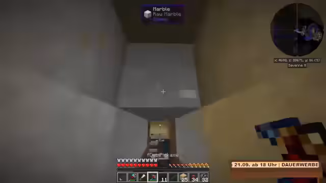 06:11:28Nach der Lösung eines technischen Stromproblems und der Wiederherstellung der Energieversorgung widmet sich der Fokus der Mobfarm. Es wird eine Anlage zur automatischen Verarbeitung der Drops entworfen, mit einem Item-Puffer als zentralem Element. Dieser Puffer dient als Überlaufschutz und ermöglicht eine flexible Lagerung von Items, um sie später für den Spawner wieder zu verwenden. Parallel wird die Struktur der Mobfarm mit Granit-Elementen aufgewertet, um ein effizienteres und schöneres Aussehen zu erzielen.