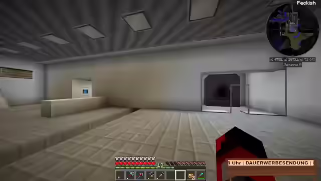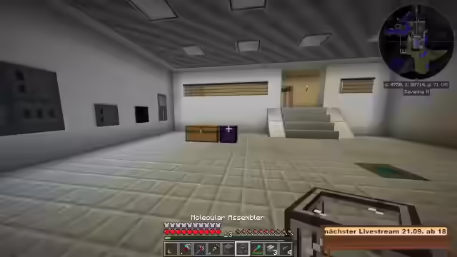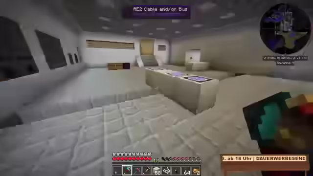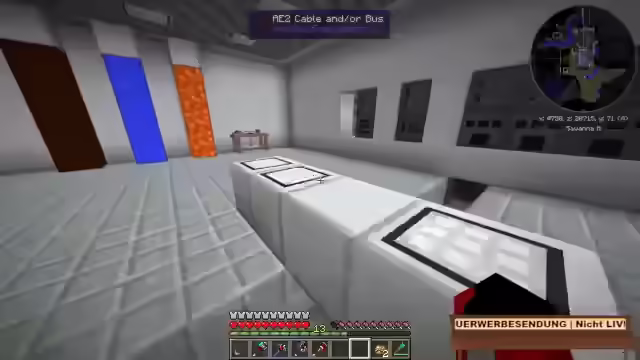 07:10:18Der Boden wird fertiggestellt und mit Enlighted Clear Glass beleuchtet, um Monsterspawns zu verhindern. Das Kabel wird in alle Richtungen verlegt. Es wird überlegt, ein rotes Kabel zu verwenden, um es stylischer und heller zu machen. Das ME Crafting Ding, also die Crafting Prozessoren, werden platziert. Die andere Seite wird im Stream gemacht. Es wird versucht, in der Folge etwas anderes zu zeigen als im Stream. Der Bereich wird schön beleuchtet. In der Mitte sollen die Crafting-Einheiten rein. Es wird geprüft, wie groß die ME-Interfaces sind und wie sie hinpassen. Die Crafting Units werden parallel zu den Servern platziert. Molekular Assembler und ME Interfaces sollen in die Mitte kommen. Es wird geprüft, ob genug Platz vorhanden ist. Es wird erwähnt, dass das Auge mitisst und dass das Ganze sehr teuer wird. Es wird überlegt, erstmal nur eine Seite zu machen. Ein Interface und ein Molekular-Assembler sind bereits vorhanden. Es wird erklärt, wozu der Molekular Assembler dient und dass er die Crafting-Rezepte verwaltet. Das Ganze wird sehr teuer. Es soll in der nächsten Folge Strom gemacht oder eine Höhle für Strom ausgegraben werden.