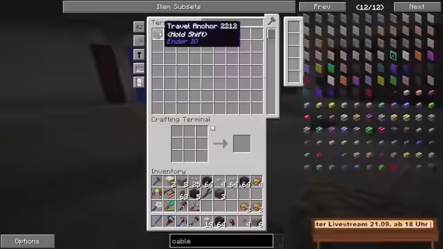 06:59:04Es wird überlegt, welche Farbe die Kabel haben sollen, wobei zunächst Weiß oder Grau in Betracht gezogen wird. Es werden Dense-Kabel und Smart-Kabel mit Wolle hergestellt. Covered Cables haben 8 oder 32 Kanäle. Eine andere Farbe soll für die ME-Monitore verwendet werden. Es werden Charged Quarz für die Kabel benötigt. Die Kristalle können automatisiert im Wasser hergestellt werden. Es werden weiße Kabel hergestellt und mit Fluxkabeln verbunden. Ein weißes Terminal wird platziert. Graue Kabel sollen nach unten verlegt werden. Es wird überlegt, die Kabel im Boden mit Glas zu verlegen, um Lichtprobleme zu lösen. Enlightened Key Glass soll verwendet werden, um den Bereich zu beleuchten. Es wird überlegt, eine andere Farbe für den unteren Bereich zu verwenden. Factory Blocks wie Wireframe und Worn metal wall with ventilation openings werden in Betracht gezogen. Ein Travel Anchor könnte platziert werden. Es wird überlegt, das ME-System auf dem Boden zu platzieren.