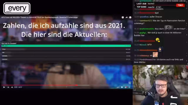 00:36:29Der Streamer wendet sich politischen Themen zu, insbesondere den Bundestagswahlen und den darauf folgenden Debatten. Er äußert sich kritisch zu verschiedenen politischen Gruppierungen, darunter die AfD, und stellt deren Behauptungen über Wahlbetrug in Frage. Er argumentiert, dass die meisten dieser Behauptungen auf 'Bauchgefühl' statt auf Fakten basieren und kritisiert die Verwendung von Verschwörungstheorien. Gleichzeitig verteidigt er die Linkspartei und deren Politikpositionen, insbesondere im Vergleich zu anderen Parteien. Diese Abschnitte sind von einer intensiven politischen Debatte und einer klaren linksgerichteten Position geprägt.