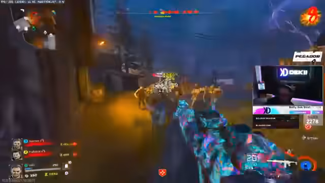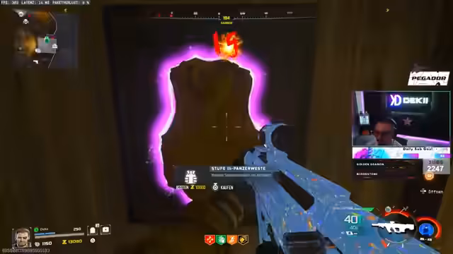08:14:51Die Spieler konzentrieren sich auf die Gold-Challenge für ihre Waffen. Es wird erklärt, dass man dafür das Feuerwerk-Aufsatz nutzen muss, um Zombies zu sammeln und dann mit dem Feuerwerk zu tötern. Dies wird als schnellste Methode für die Gold-Challenge und die nächste Tarnungsstufe angesehen. Es wird auch über das Leveln von Waffen gesprochen, insbesondere über die Schwierigkeit, bestimmte Kills zu erzielen, wie zum Beispiel 15 mal 10 schnelle Kills. Die Spieler sind motiviert, ihre Waffen schnell zu leveln, um die begehrten Tarnungen freizuschalten.
