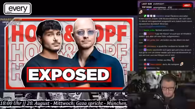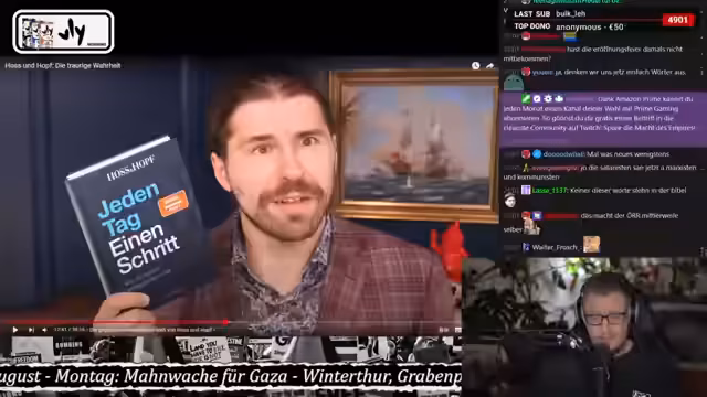 01:36:33Der Streamer analysiert die Geschäftsmodelle von Hoss und Hopf, deren Bücher und Veranstaltungen er als Selbsthilfe-Industrie kritisch betrachtet. Er stellt fest, dass deren Erfolg nicht auf politischer Radikalisierung beruht, sondern auf einem Mangel an eigenständigen Ideen und der,copy-paste Methode aus anderen Selbsthilfe-Büchern. Dabei kritisiert er die Diskrepanz zwischen dem kritischen Ton gegenüber dem Establishment und der eigenen kommerziellen Ausrichtung.