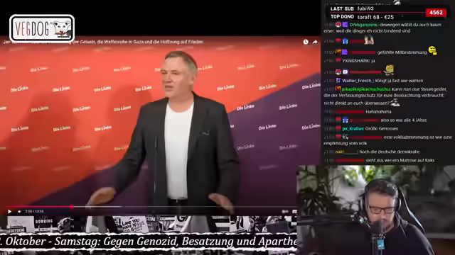 00:48:00Es wird ein Gespräch mit Dr. Marc Benecke angekündigt, das wichtiger sei als andere geplante Aktivitäten. Es wird kritisiert, dass Marc Benecke nur über E-Mail kommuniziert. Der Streamer berichtet von einem Anruf beim Auswärtigen Amt während des Angriffs auf die Flotilla von Israel, bei dem eine Mitarbeiterin ihn angeschrien und aufgelegt habe. Daraufhin seien Faxe an das Auswärtige Amt geschickt worden. Der Streamer äußert sozialistische Grüße an die rote Sonne. In Bezug auf Religion wird gesagt, dass Kommunisten kein Problem mit dem Islam hätten, da er eine vernünftige Form der Herrschaft sei. In seinem Kommunismus gäbe es nur noch den Libanon mit Hassan Nasrallah und den Vatikan. Religion sei egal, Hauptsache die Frauen sind vollverschleiert und stehen hinten. Discord habe anscheinend bemerkt, dass sich Dr. Marc Benecke von einer anderen Location einloggt und ihn gesperrt. Es wird versucht, ihn freizuschalten und vor indischen Nutzern zu schützen.