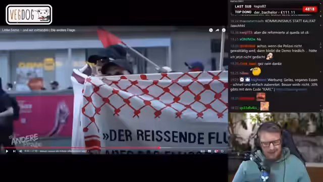 02:18:34Auf einer Demonstration in Berlin wird eine Person mit einer Flagge angesprochen, die zu einer in Deutschland verbotenen kurdischen Partei gehört. Der Streamer stellt fest, dass diese Organisation, wenn es gegen den Islamischen Staat geht, von westlicher Seite toleriert und sogar bombardiert wird. Das Aufkommen von Pyrotechnik und verbotenen Parolen bei der Demo wird thematisiert, wobei die Polizei hierauf nur selten eingreift und keine klare Begründung für diese Zurückhaltung liefert.