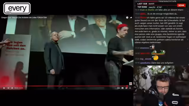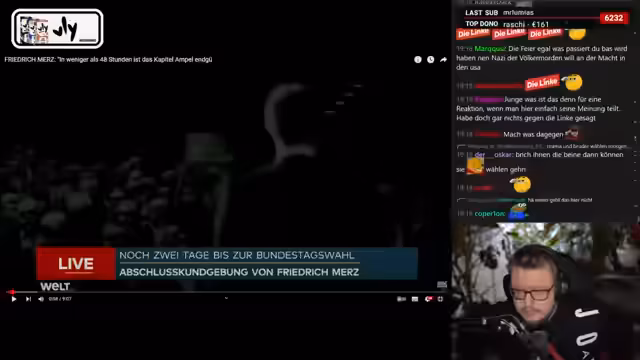 02:56:00Im Stream wird intensiv über Wahlkampfthemen diskutiert, wobei der Sprecher die Linke als wichtige Oppositionskraft darstellt. Er kritisiert die etablierten Parteien, insbesondere die CDU/CSU, und thematisiert die historische Bundestagswahl. Der Fokus liegt dabei auf der Verhinderung rechtsextremistischer Tendenzen und der Stärkung linker Positionen in der öffentlichen Debatte. Der Streamer setzt auf die Mobilisierung von Wählern, insbesondere junger Menschen, und betont die Bedeutung der Bundestagswahl als entscheidenden Moment für die zukünftige politische Ausrichtung Deutschlands.