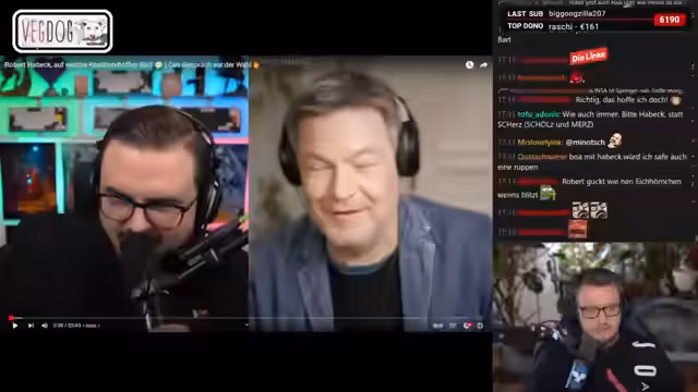 00:48:49Die Stimmung im Stream lockert sich auf, als es um Robert Habecks Vorlieben für Kaffee oder Tee geht. Dabei wird humorvoll spekuliert, ob ein Wechsel auf Tee politische oder geschmackliche Gründe haben könnte. Es folgen Anekdoten über Habeck und dessen persönliche Kommunikation mit dem Streamer, die den Eindruck sympathischer Begegnungen erweckt, bleibt aber kritisch im Ton.