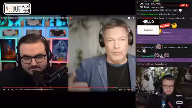 00:45:00Der Streamer grenzt sich persönlich von den Grünen ab und betont seinen grünen Hass, der sich konkret auf deren politische Ausrichtung bezieht. Er fragt rhetorisch, warum die Grünen nicht offiziell bürgerliche Mitte Partei heißen und nennt deren Wahlkampf als leeres Versprechen ohne inhaltliche Substanz. Er appelliert direkt an die Zuschauer, bei der Linkspartei zu bleiben, weil diese die tatsächlich progressive Politik vertritt.