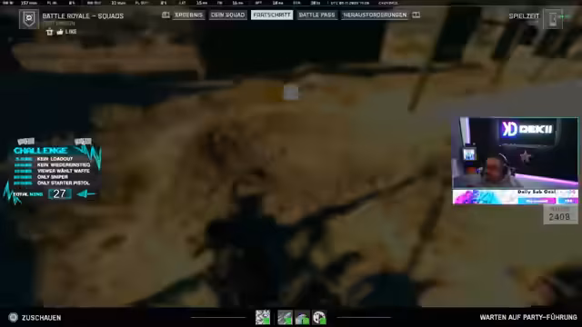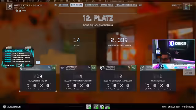 05:26:46Die Spieler sind kurz davor, die Challenge abzubrechen, da sie nur noch drei Wins benötigen, aber die Frustration über das Spiel und die Gegner zu groß wird. Die Idee, sich die Haare pink zu färben, wird als letzte Konsequenz in den Raum gestellt. Es wird diskutiert, wie man die verbleibenden Wins am besten erzielen kann, wobei Vorschläge wie das Landen in sicheren Zonen und das Nutzen von Panzern gemacht werden. Die Spieler äußern ihren Unmut über die mangelnde Unterstützung im Team und die Übermacht der Gegner. Die Möglichkeit, das Spiel für heute zu beenden und morgen weiterzumachen, wird ebenfalls in Betracht gezogen, um weitere Kopfschmerzen zu vermeiden.