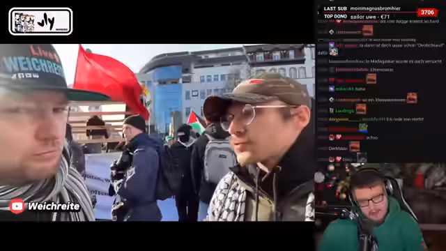 01:09:32Es kommt zu einer direkten Konfrontation auf einer Demonstration in Connewitz. Weichreite, ein rechter YouTuber, wird von Teilnehmern einer linken Demo angesprochen und provoziert. Nach einem verbalen Austausch, bei dem Weichreite eine Spuckattacke erleidet, eskaliert die Situation. Weichreite gibt an, bei einem Versuch, den Angreifer festzuhalten, selbst zu stürzen und sich zu verletzen. Er erstattet Anzeige wegen Nötigung.