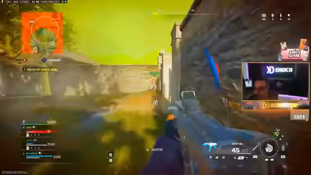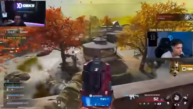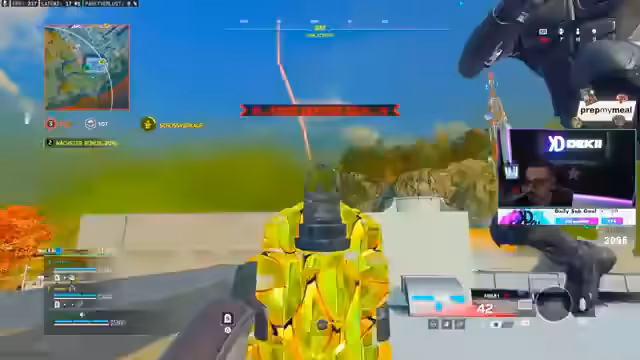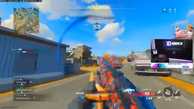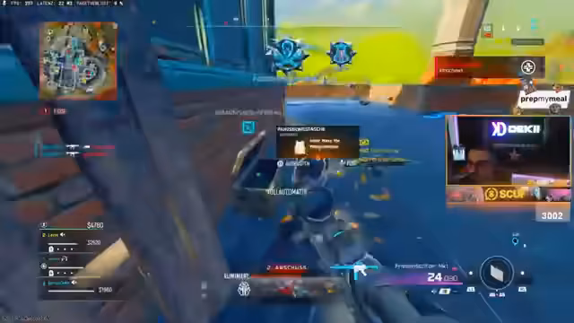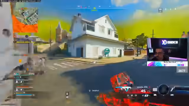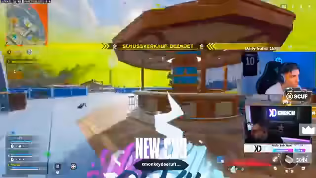 05:03:15Der Streamer befindet sich in einem erbitterten Kampf gegen mehrere gegnerische Teams. Es kommt zu zahlreichen knappen Duellen, bei denen er Gegner knallt, oft nur knapp verfehlt oder selbst getötet wird. Er beschreibt dynamische Spielzonen, ständige Bewegung und die Notwendigkeit, seine Mitspieler zu koordinieren, um in der engen Map mit wenigen Teams überleben zu können.