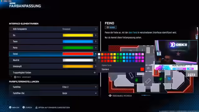 06:28:40Das Gespräch verschiebt sich auf die Anpassung der Benutzeroberfläche, um die Spielbarkeit zu verbessern. Der Streamer und seine Mitstreiter diskutieren über den Nutzen von farbigen Danger-Pings anstelle der standardmäßigen roten. Während einige Spieler, wie Dongy, eine grüne Farbauswahl nutzen, um auf der Minimap besser zu erkennen, ist die Wirksamkeit umstritten. Über die Einstellungsmöglichkeiten für die Feind- und Neutral-Symbolisierung auf der Karte wird gesprochen, um das Situationsbewusstsein zu erhöhen.