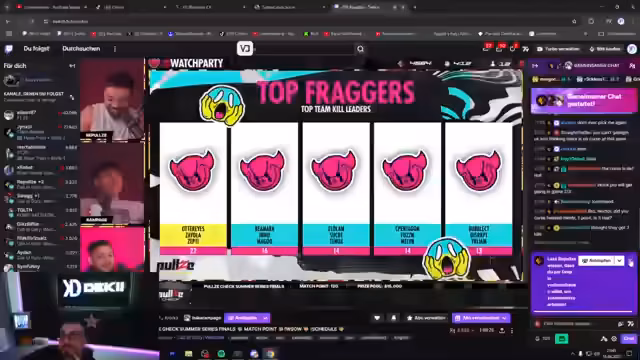 02:44:08Der Streamer feiert beinahe einen Matchpoint in einer Runde. Die aktuelle Tabellenstellung wird vorgestellt, und es wird analysiert, welches Team die größte Bedrohung für den Gesamtsieg darstellt. Die Lage ist knapp, da nur wenige Punkte die Plätze trennen.