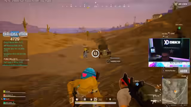 11:48:41Der Streamer beendet sein Fortnite-Spiel und wechselt zu PUBG. Die anfängliche Hoffnung, in diesem Spiel erfolgreich zu sein, zerschlägt sich schnell. Das Team, das aus dem Streamer, Ersin und einem weiteren Spieler besteht, hat massive Probleme mit der Koordination und der Strategie. Sie finden kaum Loot und sind sich in den eigenen Bewegungen unsicher. Der Streamer wird mehrere Mal aus dem Spiel eliminiert und kritisiert sich selbst sowie seine Mitspieler für mangelndes Taktikverständnis, was zu einem chaotischen und erfolglosen Spielverlauf führt.