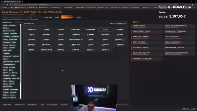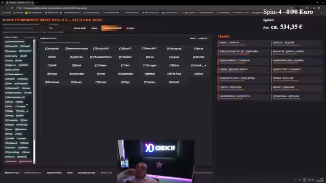 00:18:09Der Streamer und Andi, der Turnier-Host, erklären den detaillierten Ablauf per Discord-Übertragung. Alle Teilnehmer werden auf ein Rad gelost. Wenn ein Spieler wie Dekki an der Reihe ist, wird ein zweites Rad für seinen "Mate" gedreht, z.B. C-Pentagon. Dekki muss nun für diesen C-Pentagon einen Partner wählen, wobei er dessen Siegchancen bewusst sabotieren wird. Die Teilnehmer müssen innerhalb eines Timers picken, sonst wird ein zufälliger Mate zugewiesen. Zudem wird über die Finanzierung und den Geldpool für die Spins gesprochen.