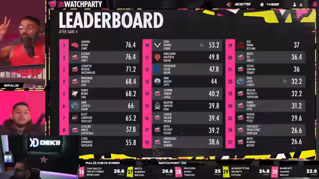06:49:12Nach der Runde präsentiert der Streamer die aktuellen Platzierungen des Scrims. Er führt die Top 5 Teams und die Top 5 Team-Kill- sowie Einzel-Frager-Statistiken vor. Sein Team, Deki, Lace und Stukex, befindet sich aktuell auf dem zweiten Platz mit 97,4 Punkten. Die Diskussionen drehen sich um die Dominanz anderer Teams wie Vision Esports und die schiere Kill-Anzahl in der Lobby, was die hohe Qualität des Wettbewerbs unterstreicht.