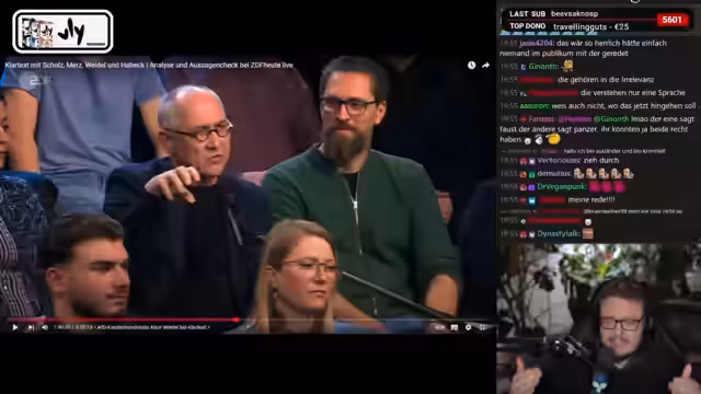 05:07:29Nach einer insgesamt fünfstündigen Diskussion wird der Stream beendet. Der Streamer bittet um Entschuldigung für die lange Laufzeit und kündigt für den Folgetag eine Sendung mit Friedrich Merz an. Er bedankt sich für die Aufmerksamkeit der Zuschauer und kündigt seine weitere Präsenz auf der Plattform für den nächsten Morgen an. Bevor das Programm offiziell endet, werden einem anderen Streamer per Raid Grüße übermittelt und der Streamer verabschiedet sich.