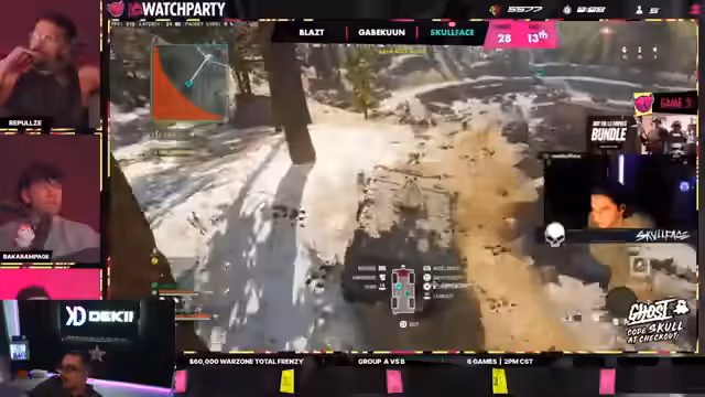 04:04:32Das Team ist im Endgame angelangt und konfrontiert ein gegnerisches Team im Wasser. Ein Spieler wird durch einen Schnappschuss aus der Ferne ausgeschaltet. Es kommt zu einem Häuserkampf, bei dem der Streamer unter Druck gerät. Obwohl das Team in einer strategisch günstigen Position ist, agiert der Streamer zu vorsichtig und wird 'nocked'. Er muss den Gulag nutzen, was seine Position in der Runde gefährdet und Punkte kostet.