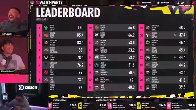 03:37:16Der Streamer präsentiert das aktuelle Leaderboard des $1,000,000 WSOW SCRIMS. An erster Stelle liegt das Team Diaz, Soka und Shifty mit 111 Punkten, gefolgt von Clamp, Ketchup und Netto mit 76,4 Punkten. Alle Teams haben gute Leistungen gezeigt, und es wird diskutiert, ob das führende Team den Matchpoint erreichen wird. Die Kommentatoren zeigen sich beeindruckt von der Leistung und der Dominanz der Teams an der Spitze des Leaderboards.