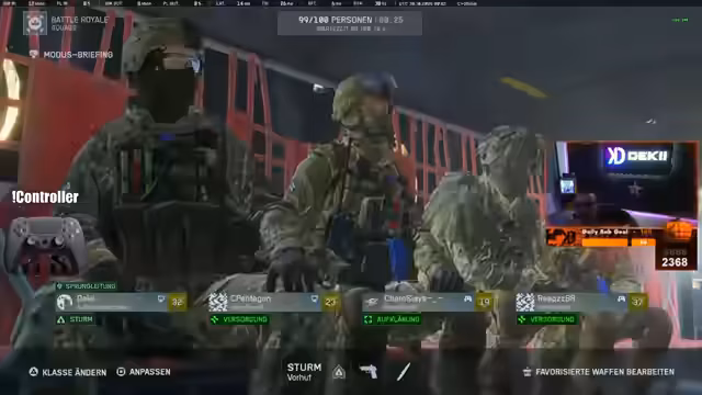 00:11:53Eine besondere Neuerung im Stream ist die Einblendung des Controllers unter der Webcam, eine Funktion, die früher aufgrund des Dual-PC-Setups nicht möglich war. Scuf hat dem Streamer jedoch erklärt, wie dies zu realisieren ist, was die Zuschauer sehr begrüßen. Das Gameplay startet mit Duos, wobei der Streamer seine Begeisterung für das Spiel zum Ausdruck bringt und sich über die vielen Anfragen nach seinen Settings wundert, da bereits viele andere Streamer ähnliche Videos veröffentlicht haben. Er betont, wie sehr ihm das Spiel gefällt, obwohl einige auf Instagram es als 'Müllgame' bezeichneten. Die Flüssigkeit des Spiels wird mit Call of Duty verglichen, wobei Battlefield als etwas weniger 'fluid' beschrieben wird, was jedoch den Spielspaß nicht mindert. Der Streamer hofft auf Turniere und Wager-Matches in der Zukunft.