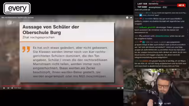 02:37:07Der Stream thematisiert das zunehmende Problem rechtsextremer Jugendlicher. Gruppen wie die "Heimat" und der "Dritte Weg" gezielt nach Nachwuchs suchen, insbesondere in Hooligan- und Fußball-Szenen. In einer Schule in Burg klagen Lehrer über systematische Einschüchterung und Ausgrenzung von Schülern mit demokratischer Gesinnung. Der ZDF-Bericht zeigt, wie Neonazis aktiv an Schulen Flyer verteilen und Minderjährige mit Propaganda konfrontieren. Man analysiert, warum rechte Bewegungen für junge Männer attraktiver sind, da sie einfache Identitätsstiftung anbieten, während linke Gruppen oft als akademisch und schwer zugänglich wahrgenommen werden.