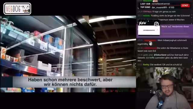00:55:07Der Streamer lenkt die Aufmerksamkeit auf einen anderen Live-Stream, der von Team Wallraff im Kaufland aufgezeichnet wurde. Er zeigt Ausschnitte und reagiert darauf. Es geht um mangelnde Hygiene in den Kaufdetekten, insbesondere um ranzige und verdorbene Lebensmittel. Dabei wird humorvoll und provokant über die Eignung des Streamers "Kilo" für einen solchen Undercover-Einsatz gescherzt, da er sofort auffallen würde. Es wird auch kurz auf die schlecht bezahlte und undankbare Arbeit im Einzelhandel eingegangen.