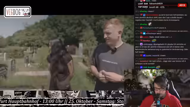 00:19:01Der Stream beginnt mit der Musik 'Into you, into you.' und dem Ausspruch, dass das Wrestling der WW kein 'weep shit' für Erwachsene sei, bei denen sich Oberkörperfreie mit Öl ringen würden. Anschließend werden Zitate von Kampfgesängen aus Nordirland, wie 'A comrade on me left and another on me right And a clip of ammunition for me little arm of life', und eine Parodie auf das ZDF von 2017 angespielt, die eine 'rote Sonne' zur Bekämpfung von Faschismus preist.