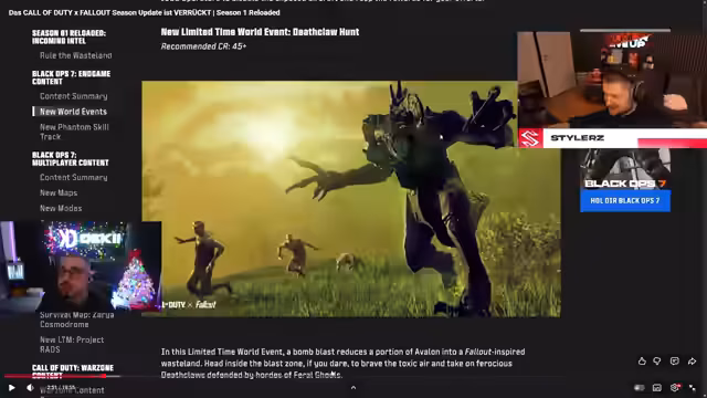 00:45:35Am Donnerstag um 18 Uhr startet das Mid-Season Update für Season 1 in Call of Duty. Es umfasst Updates für Multiplayer, Zombies, Endgame und Warzone. Ein riesiges Fallout-Crossover wird eingeführt, mit neuen Skins, Waffenaufsätzen und der Rückkehr der Ballista aus Black Ops 2. Zudem gibt es einen eigenen Event-Pass und einen neuen Operator. Der Streamer plant, das Update im Livestream zu analysieren.