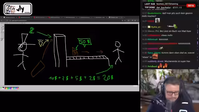 00:32:34Ein zentraler Teil des Streams ist die Erklärung der marxistischen Mehrwerttheorie anhand einer vereinfachten Paint-Zeichnung. Es wird das klassische Beispiel eines Kapitalisten mit Monokel und Zylinder und eines Arbeiters am Fließband dargestellt. Der Streamer legt dar, dass der Kapitalist die Produktionsmittel besitzt und der Arbeiter für einen Lohn arbeitet. Der Mehrwert, also der Wert, der über die Arbeitslöhne hinausgeht, wird als der Profit des Kapitalisten identifiziert. Es wird betont, dass Mehrwert nicht ideologisch, sondern messbar und das Fundament des Kapitalismus und der Ausbeutung sei. Der reformistische Ansatz, nur die Löhne zu erhöhen, wird als unzureichend angesehen, da das System der Mehrwertabschöpfung selbst das Problem sei.