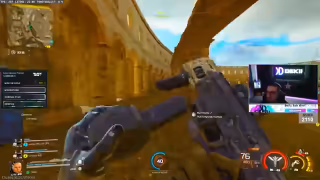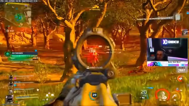 12:21:49Der Streamer befindet sich im Kampagnenmodus auf der Warzone-Map Avalon und muss Wunder-Kills mit acht Aufsätzen erzielen. Er äußert seine Begeisterung für den Modus, obwohl er Schwierigkeiten hat, die Pflanzen-Challenges abzuschließen. Er verbringt 15 Minuten in einem Haus, um Pflanzen zu finden, und ist frustriert über die geringe Anzahl, die er findet. Die Community diskutiert über die Schwierigkeit dieser Aufgabe und schlägt vor, stattdessen Zombies auf den Bergen zu töten. Es wird auch ein Verbindungs-Bug erwähnt, der die Kamera des Streamers beeinträchtigt. Die Diskussion geht weiter über technische Probleme, insbesondere mit Mikrofon-Einstellungen, und die Notwendigkeit, die Empfindlichkeit anzupassen, um eine bessere Audioqualität zu gewährleisten. Der Streamer bemerkt, dass die Gold-Tarnungen unterschiedliche Anforderungen haben, wie zum Beispiel Kills aus nächster Nähe oder das Zerstören von Robotern mit dem Friedensstifter.