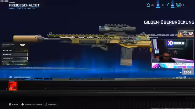 12:05:39Der Streamer freut sich über den schnellen Fortschritt bei den Gold-Camos und die Möglichkeit, fast eine Waffe pro Runde auf Gold zu bringen. Die Entscheidung, den Multiplayer zugunsten des aktuellen Modus zu verlassen, wird als „beste Leben“ bezeichnet. Es wird der Wunsch geäußert, am Ende, wenn alle Tarnungen fertig sind, „Rages rein“ zu gehen und Jan damit zu überraschen. Der Modus, in dem die Kampagnen-Camos gespielt werden, wird als „Endspiel“ (Endgame auf Englisch) bezeichnet und als „geistkrank Spaß“ empfunden, besonders für Camos. Die Motivation und der Spaß am Grinding sind spürbar.