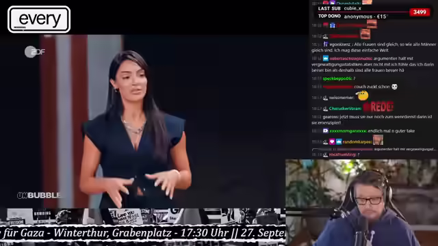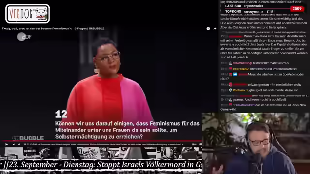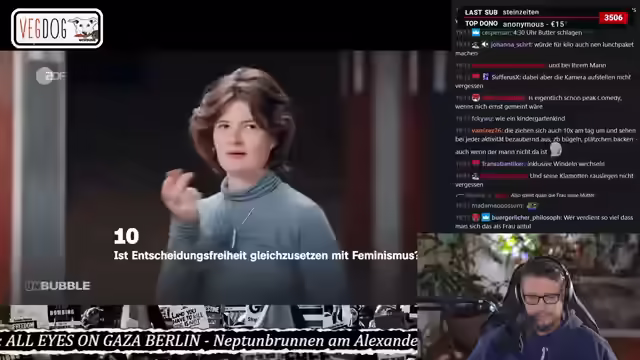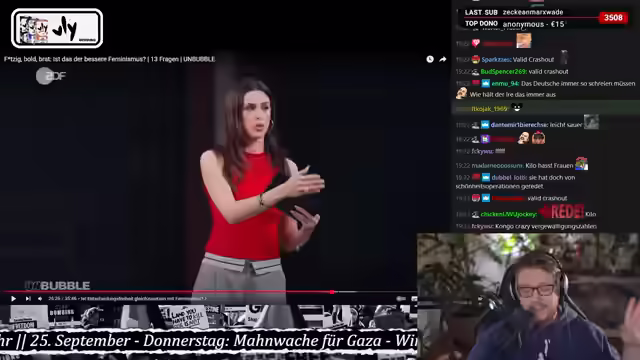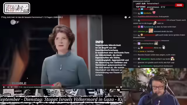 00:46:24Es wird eine gemeinsame Reaktion mit Kilominati auf ein Video zum Thema Feminismus angekündigt, die sowohl auf YouTube als auch auf Twitch stattfinden soll. Kilominati wird als Bruder und Podcast-Genosse vorgestellt, dessen letzte Podcast-Episode aufgrund eines Vorfalls entfernt werden musste. Es wird humorvoll auf ein verpasstes Manscaped-Placement angespielt. Das ausgewählte Video, '13 Fragen zu modernem Feminismus' von Bubble, wird als potenzieller 'Bruch' für die eigene Positionierung beschrieben. Es wird angekündigt, dass man sich während des Videos zurückhalten und erst nach den Beiträgen des 'blonden Mannes' zu Wort melden wird. Technische Probleme mit dem Ton werden behoben, bevor das Video gestartet wird. Es wird ironisch kommentiert, dass man sich gewünscht hätte, nichts zu hören, als die ersten Aussagen des Videos über Männer in Käfigen und Selbstbestimmung gehört wurden. Es wird betont, dass man es 'mega base' findet, Männer in Käfige zu packen und selbstbewusst mit dem eigenen Körper umzugehen.