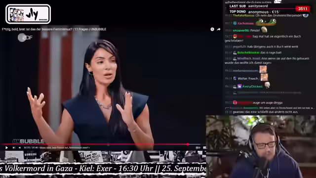 00:37:55Es wird überlegt, gemeinsam ein Video anzuschauen, wobei Jan Schippmann vorgeschlagen wird. Alternativ werden witzige Optionen wie 'Monte in Amerika' oder 'Tobias Huch und Pierre Vogel zusammen' in Erwägung gezogen. Letztendlich entscheidet man sich für das Thema Feminismus und wählt das Video '13 Fragen, 40, Bold und Brett, ist das der neue Feminismus?'. Es wird humorvoll angedeutet, dass dies möglicherweise zum Verlust des Twitch-Kanals führen könnte, da man sich mit den 'Links-Liberalen' unbeliebt macht. Es wird angekündigt, dass man das Video gemeinsam mit Kilominati im Discord ansehen und übertragen wird. Technische Vorbereitungen für die gemeinsame Reaktion werden getroffen, inklusive Doppelfacecam und Aktivierung des Chats, um die Meinungen der Zuschauer einzubeziehen. Es wird humorvoll bemerkt, dass man aufgrund mangelnder Streaming-Fähigkeiten beide Facecams nur im Stream von Kilominati sehen kann.