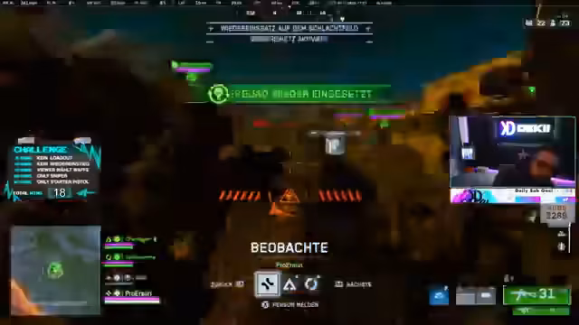 00:10:04Ein zentrales Element des Streams sind die verhängten Handicaps. Aufgrund von Spenden im Chat darf der Streamer für mehrere Runden keinen Lord spielen, was die Strategie erheblich beeinflusst. Die Beschränkung auf bestimmte Waffen und Loadouts wird als 'todesgeil' und 'schwer' eingestuft, zwingt das Team aber, alternative, kreativere Spielweisen zu entwickeln, um dennoch Wins zu erzielen.
