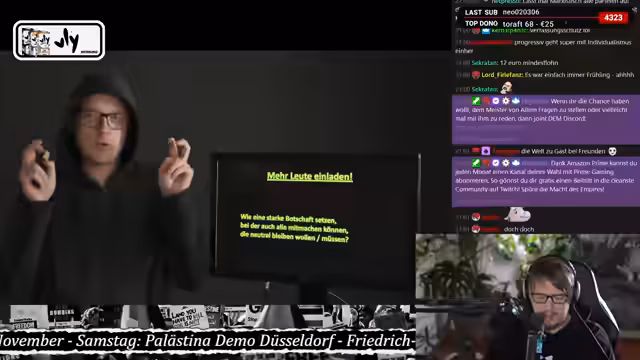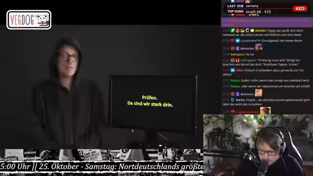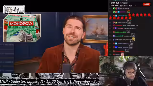 00:23:11Der Stream beginnt mit einer satirischen Einführung, die sich selbst als Präsentation des Ministeriums zur Bekämpfung und Förderung von Propaganda darstellt und faschistische Abgründe zum Wohle der Allgemeinheit aufzeigt. Es folgen humorvolle technische Anpassungen der Kamera, bei denen die Schärfe des Gesichts des Streamers bewusst reduziert wird, um die Zuschauer zu schonen und den Fokus auf den Hintergrund oder die Pflanzen zu lenken. Dies wird mit selbstironischen Kommentaren untermauert, die die eigene Erträglichkeit infrage stellen. Die Diskussion über die Arbeitsmoral und das Befolgen des 'Märzschen Arbeitspathos' leitet über zu einer Auseinandersetzung mit neuen Twitch-Funktionen, insbesondere dem 'Hypetrain' und 'Creator-Zielen'. Es wird enthusiastisch über die potenziellen Mehreinnahmen durch diese Features gesprochen, wie Emote-Flammenwerfer und spezielle Alerts, die den Support der Community anheizen sollen. Die Ironie, dass der Kapitalismus doch Innovationen hervorbringt, wird dabei nicht ausgelassen, während gleichzeitig die Implementierung dieser neuen Tools geplant wird, um zukünftige Einnahmen zu maximieren.