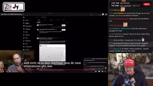 03:09:55Es wird eine Ironie konstatiert, dass Deutschland die AfD als 'extremistisch' brandmarkt und verbannen möchte, während gleichzeitig J.D. Vance Deutschland als Beispiel für Meinungsfreiheit preist. Der Streamer kritisiert, dass Themen wie 'Germany Just Killed Democracy' nur Clickbait seien und keine tatsächliche Rolle im Stream spielen. Gleichzeitig wird die Kritik an einer sich als tolerant gebenden Gesellschaft, die jedoch vermeintlich Behinderte verspottet, als heuchlerisch entlarvt.