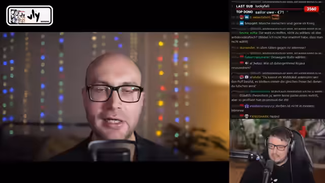 03:00:05Es folgt eine enthusiastische Würdigung von Simon und Ole, die als politische Kommentatoren im öffentlich-rechtlichen Fernsehen auftreten. Ihre Fähigkeit, ruhig und sachlich Argumente vorzubringen und unbequeme Fragen zu stellen, wird als 'Lichtmoment in der medialen Welt' gelobt. Der Streamer ruft sie explizit auf, in seinen Podcast zu kommen, um ihre Perspektiven zu teilen und wird hierbei von seinem Publikum unterstützt.