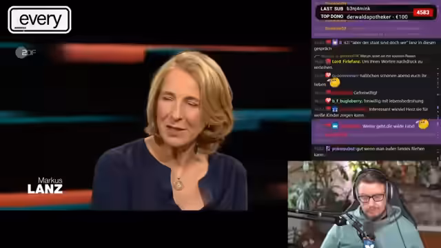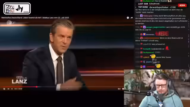 00:34:35Ein zentrales Thema ist die offene und aggressive Befürwortung von Krieg und deutscher Aufrüstung. Der Stream äußert den Wunsch nach einem 'wehrhaften Deutschland', das sich gegen einen russischen Angriff stellt, und preist die NATO. Er kritisiert eine gezeigte Talkshow mit Ole Niemann, in diesem Niemann ablehnt, für Deutschland an der Front zu sterben. Für den Streamer ist dies Feigheit, während er selbst eine massive Aufrüstung und sogar präventive Angriffe auf Moskau befürwortet, da 'Angriff die beste Verteidigung' sei.