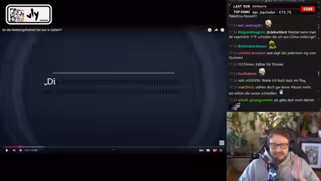 01:07:32Der Streamer analysiert das Video von MrWissen2go zur Meinungsfreiheit und äußert sich kritisch. Er bezeichnet die Darstellung der Meinungsfreiheit in Deutschland als eine Front, die von sogenannten 'Ekelhafte[n] Meinungsverbrechern' ausgeht. Insbesondere übt er scharfe Kritik an Personen, die mit Palästina-Flaggen demonstrieren, aber gleichzeitig eine 'anti-queere Hamas' unterstützen. Für ihn sind solche Doppelmoralisten die 'wahren Faschisten'.