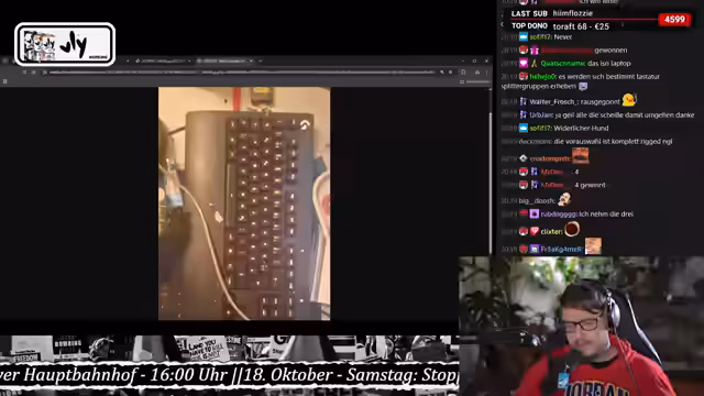 02:58:47Die Auswahl der Gewinner-Tastatur wird als 'High Class Shit' bezeichnet, wobei der Sprecher die kreative Nutzung von zwei Bildschirmen für den Stream und die Donald Trump-Fanartikel als Beleg für seine These über die Zuschauerentwicklung anführt. Es werden verschiedene Tastatureinreichungen humorvoll bewertet, von 'Silicon Valley Startup Setup' bis hin zu 'proletarischen' Lösungen mit Panzertape. Letztendlich werden vier Tastaturen zur Abstimmung gestellt, wobei der Sprecher die Wahl als eine Form der 'Demokratieverdrossenheit' im zweiten Wahlgang bezeichnet, da die Wahlbeteiligung stark zurückgeht. Er kritisiert, dass die wirklich wichtigen Fragen, wie das Schicksal der Tastatur (Behalten, Ebay oder Zerstörung), gar nicht zur Wahl standen, was er als eine Form der 'Demokratiefeindlichkeit' interpretiert, die 'Weimarer Zustände' annimmt. Der Gewinner wird schließlich für seine Ehrlichkeit bei der Darstellung seiner nicht gereinigten Tastatur und seine Kritik an den anderen Teilnehmern, die ihre Tastaturen gereinigt hatten, gelobt.