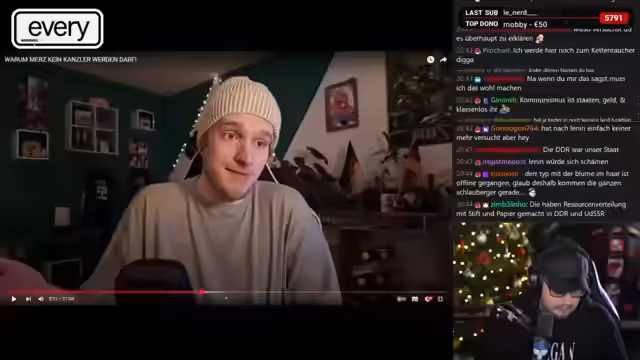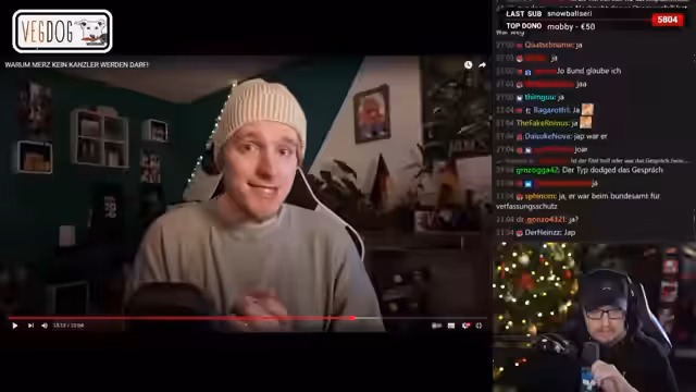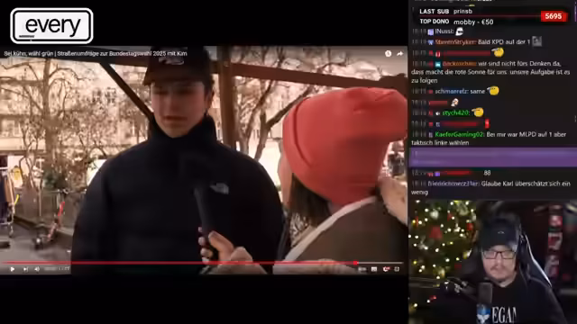 00:51:33Der Streamer präsentiert mehrere auf dem Flohmarkt geführte Interviews über die bevorstehende Bundestagswahl. Die Umfragen zeigen eine starke Tendenz hin zu den Grünen bei gleichzeitigem Unwissen über das genaue Wahldatum. Viele Befragte bestätigen, eher emotional als informiert zu wählen, und wählen primär, um die AfD zu verhindern. Die Interviews verdeutlichen eine große Verunsicherung und das Fehlen einer fundierten politischen Auseinandersetzung in der Wählerschaft.