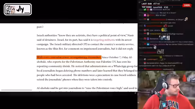00:44:42Der Streamer befasst sich intensiv mit der Situation der Journalisten im Gazastreifen. Er zitiert, dass seit dem 7. Oktober 2023 zwischen 245 und 308 Medienschaffende durch Angriffe des israelischen Militärs getötet worden seien. Er thematisiert die Schwierigkeiten für Journalisten, unkontrollierten Zugang in den Gazastreifen zu erhalten, und beschreibt die systematischen Behinderungen und Gefahren, denen Journalisten ausgesetzt sind.