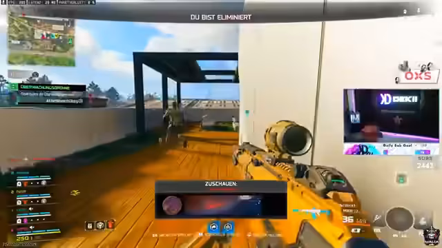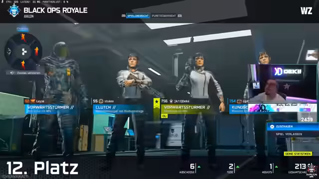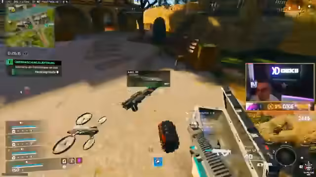 02:52:58Die Runde entwickelt sich zu einem hochgradig chaotischen Kampf. Das Team ist mit einer Vielzahl von Gegnern konfrontiert, die aus verschiedenen Richtungen angreifen. Es kommt zu schnellen Wechseln zwischen Angriff, Verteidigung und dem Versuch, Loot zu sichern. Spieler nutzen Sensordrohnen, um Feinde aufzuspüren, und es entstehen 'Bang & Bang'-Situationen. Ein Spieler gerät in eine prekäre Lage, da er keine Rüstung (Platten) mehr besitzt und somit extrem verletzlich ist. Die Kommunikation ist unter Stress schnell und direkt.