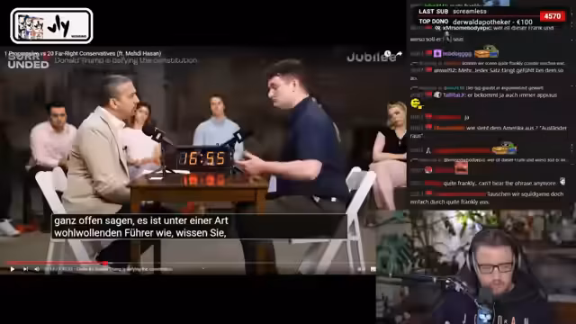 00:32:38Nach einem kurzen, scheinbar abschweifenden Monolog verkündet der Streamer, dass er heute keine Zeit für Chatinteraktion habe, da er Videos produzieren muss. Er kritisiert die Tagesschau, die offenbar versucht, Reaction-Formate einzuführen. Im weiteren Verlauf ärgert er sich über Jeffrey Epstein-Berichte und grüne Politiker, diskutiert den Fall 'Pirate Games Software' und analysiert den Einfluss von Stimmenveränderungs-Software auf YouTube.