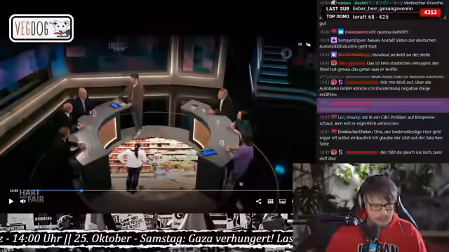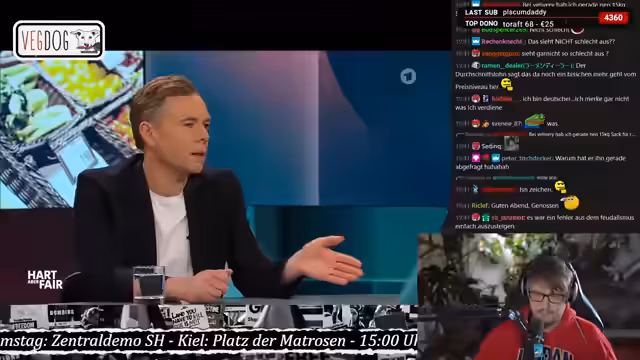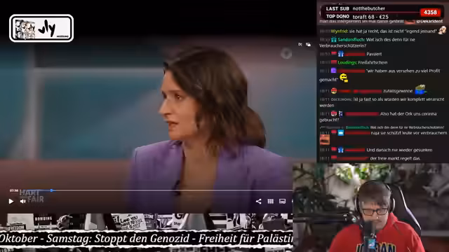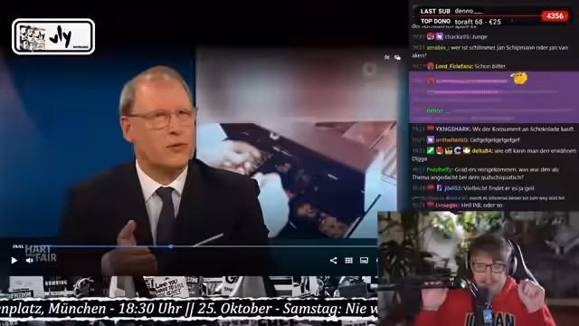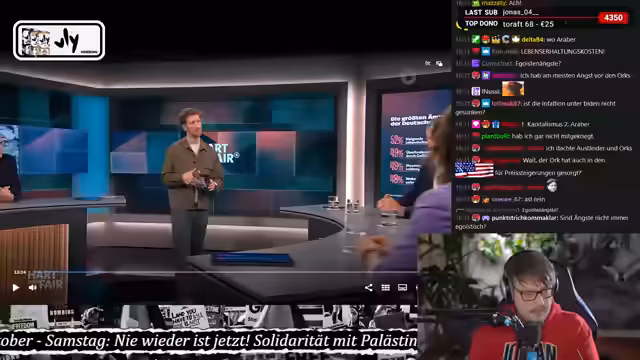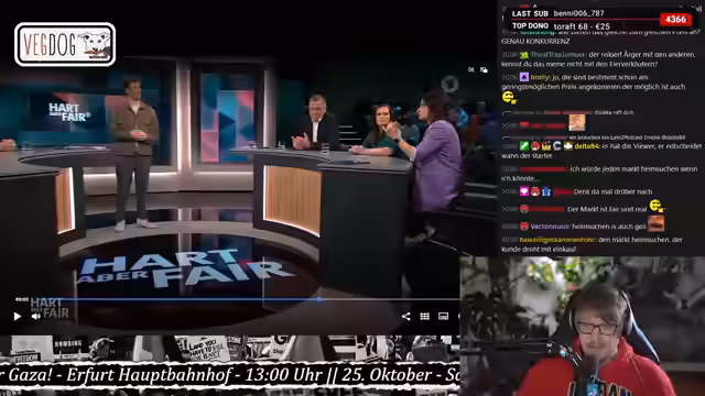 00:46:23Es wird Jan van Akens erneuter Auftritt im öffentlich-rechtlichen Fernsehen bei 'Hart aber fair' zum Thema steigende Preise thematisiert. Der Streamer äußert sich kritisch über van Akens erwartete 'Kalendersprüche' und vermutet, dass dieser die Preise auf zu hohes Vermögen oder Lebensmittelkartelle zurückführen wird. Die Zusammensetzung der Diskussionsrunde wird als unausgewogen kritisiert, da neben einem Handelsvertreter, einem CDU-Politiker und einem Wirtschaftsmogul auch eine alleinerziehende Mutter, die Tipps zum günstigen Kochen gibt, und Jan van Aken selbst teilnehmen. Es wird die Frage aufgeworfen, wen diese Runde eigentlich 'hopsnehmen' wolle, und die Absurdität der Situation hervorgehoben, insbesondere im Hinblick auf die mangelnde Transparenz der Preisgestaltung im Lebensmittelhandel.