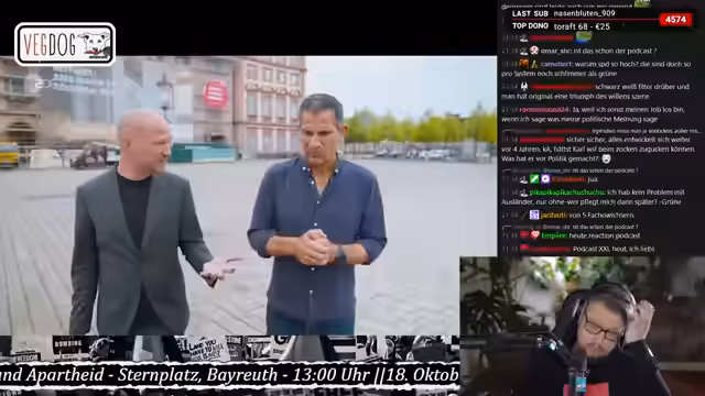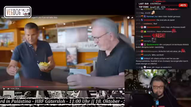 01:39:12Der Stream beginnt mit einer kritischen Auseinandersetzung mit dem Bildungssystem. Es wird eine Humboldt'sche Bildungsideal von Entfaltung der Persönlichkeit und Selbstbestimmung einem Gehoranspruch gegenübergestellt. Anschließend wird eine hitzige Debatte über die Ursachen des Nahostkonflikts geführt. Während der Sprecher von einer seit Jahrzehnten existierenden Vertreibungs- und Vernichtungspolitik Israels gegenüber dem palästinensischen Volk spricht, wird ihm entgegnet, dass der Falsch auf einen Staatsgründungskonflikt seit dem 7. Oktober 2023 gelegt werde und der Vorwurf der mangelnden historischen Bildung geäußert wird.