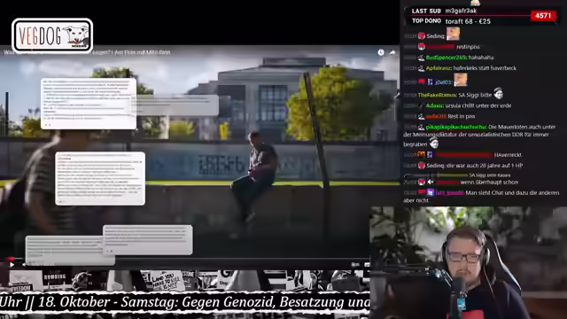 02:36:51Es wird ein Video von Tobias Huch thematisiert, das den Titel 'Ich und die Hamas' trägt und auf dem Thumbnail ein Hamas-Stirnband zeigt. Die Streamer äußern scharfe Kritik an Huchs früheren Aussagen, darunter die Behauptung, Juden würden Stürme herbeizaubern, Kreuzzüge seien Befreiungszüge, die Bibel sei die wissenschaftlichste Quelle und Adolf Hitler hätte den Holocaust nicht ohne den Mufti von Groß-Israel stattfinden lassen. Auch die absurde Behauptung, Sarah Wagenknecht sei für den Holocaust verantwortlich, wird erwähnt. Die Streamer betonen die Absurdität dieser Aussagen und ziehen Vergleiche zu Attila Hildmann, der im Vergleich zu Huch als 'akademische Quelle' bezeichnet wird. Es wird auch darauf hingewiesen, dass Huch in der Vergangenheit wegen des Hochladens von Pornovideos ohne Zustimmung und des Abzockens von Kindern in Minecraft kritisiert wurde. Die Diskussion weitet sich auf die Meinungsfreiheit im Osten Deutschlands aus, insbesondere in Döbeln, wo viele Menschen angeben, ihre Meinung nicht frei äußern zu können, und wo rechtsextreme Tendenzen und Angriffe auf Integrationsvereine zum Alltag gehören.