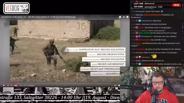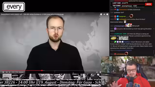 00:38:39Der Streamer wendet sich der deutschen Bundeswehr-Aufrüstung zu und analysiert ein Video des Kanals 'Sicherheit und Verteidigung'. Deutschland plant, die Truppenstärke auf bis zu 260.000 aktive Soldaten zu erhöhen und 10.000 neue gepanzerte Fahrzeuge zu beschaffen. Der Streamer zitiert die Pläne, wie 1.000 bis 2.500 Boxer-Radpanzer, 400 bis 600 Schützenpanzer Puma und 1.000 bis 4.000 Patria 6x6 Fahrzeuge. Er kritisiert die unrealistischen Freiwilligkeitspläne und deutet an, dass eine Wehrpflicht unvermeidlich sein könnte.