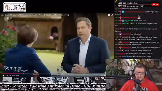 02:16:18Den Abschluss des Streams bildet eine Betrachtung des ZDF-Sommerinterviews mit SPD-Chef und Vizekanzler Lars Klingbeil. Klingbeil wird in seiner niedersächsischen Heimat gezeigt und spricht über Themen wie die Rente und den Ukraine-Krieg. Der Streamer kritisiert die Interviewsituation und die Darstellung, die transatlantische Arroganz der Politik anprangert und die Fokussierung auf den Ukraine-Krieg anstelle anderer globaler Konflikte. Er spottet über Klingbeils Engagement für Infrastrukturprojekte in ländlichen Regionen, was er als unzureichend empfindet, und stellt ironisch die Forderung nach einer 'Festung Scheseel' mit 0% Migrationsquote.