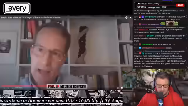 01:55:37Der Streamer interviewt Prof. Dr. Matthias Goldmann zu der Frage, ob die Ereignisse in Gaza als Völkermord einzuordnen sind. Es wird erläutert, dass internationale Fachwelt und Menschenrechtsorganisationen zunehmend von Völkermord sprechen. Die Schwierigkeit liegt in der endgültigen juristischen Feststellung, da ungeklärte Fakten und eingeschränkte Zugangsmöglichkeiten eine genaue Bewertung erschweren. Trotzdem deuten viele Indizien und Aussagen auf ein genozidales Vorgehen hin.